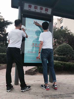 擦拭路边的宣传栏