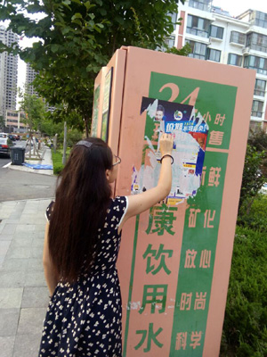 沿着香江路一路前行到武家庄小区,同学们将路上的垃圾随时捡起,也不放过许多广告栏里掉落的纸屑,将它们丢到垃圾桶里。当发现社区楼道里和许多自动售卖机旁边有许多小广告贴纸后,志愿者们进行了认真的清理。时值夏日,小广告清理起来更加困难,但同学们还是谨记自身的责任和活动精神,坚持将自己负责的区域清理干净。