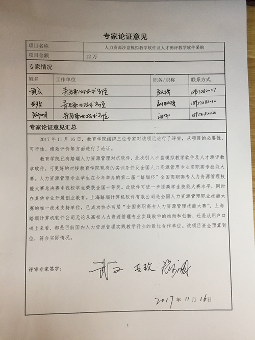 我院已有踏瑞人力资源管理对抗软件,此次引入沙盘模拟教学软件及人才测评教学软件,可更好的对接我院现有的实训条件及全国人力资源管理专业高职高专技能大赛。上海踏瑞计算机软件有限公司,是由国内知名心理学家、人力资源专家发起的,致力于高校人力资源管理实验教学软件开发和高校经管类实验室建设的高科技企业。是全国人力资源管理职业技能大赛的唯一技术支持单位,目前已成功协办两届“全国高职高专人力资源管理技能大赛”,且在今年举办的第二届“踏瑞杯”全国高职高专人力资源管理技能大赛总决赛中米兰MILAN(中国)学生荣获全国一等奖。此软件可进一步协助我院学生提高技能大赛水平, 及开展创业教育。上海踏瑞计算机软件公司无论从高校人力资源管理专业实践教学的推动和创新,还是从用户口碑上来看,都是目前国内人力资源管理实践教学行业的最佳合作单位。 |